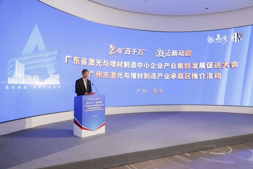 On November 24, the Guangdong Laser and Additive Manufacturing SME Industrial Cluster Development Promotion Conference and Guangzhou Laser and Additive Manufacturing Industry Undertaking Zone Promotion Event were held at the Longxi Avenue Park in the Hailongwei Science and Innovation Zone, Liwan, Guangzhou. On the same day, witnessed by responsible persons from provincial, municipal and district governments, Academician Leng Jinsong of the Chinese Academy of Sciences, and more than 100 industry representatives, the logo of the "Guangzhou Laser and Additive Manufacturing Industrial Park" was lit up, marking its official opening.