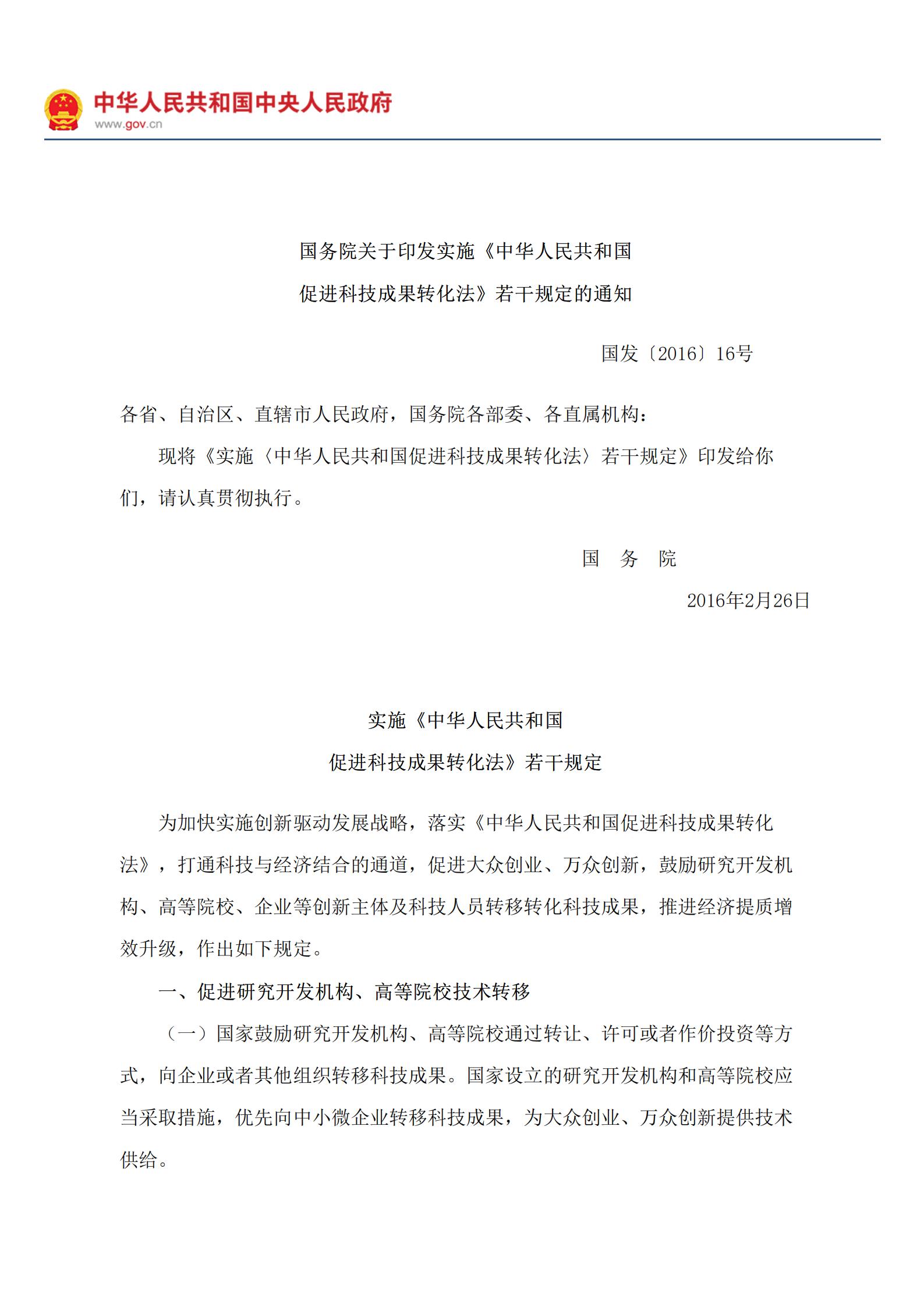Notice of the State Council on Printing and Distributing the Several Provisions for Implementing the Law of the People's Republic of China on Promoting the Conversion of Scientific and Technological Achievements